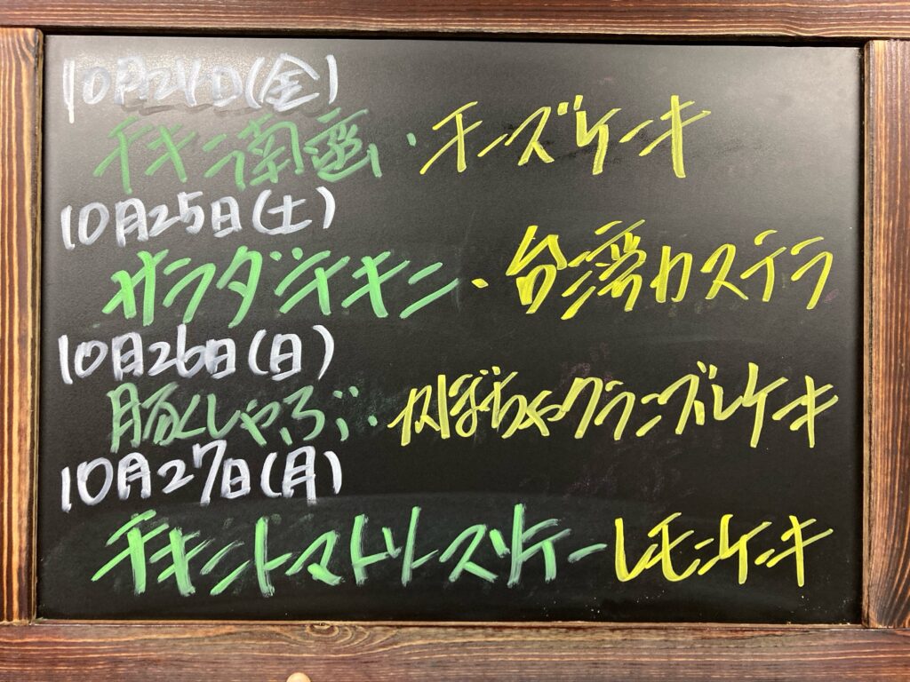 高知 カフェランチ 縁屋 メニュー 2025年10月24日(金)~10月 27日(月)香美市 土佐山田 メニュー 2025年10月24日(金)~10月 27日(月) 10月 24日(金) チキン南蛮・チーズケーキ 10月 25日(土) サラダチキン・台湾カステラ 10月 26日(日) 豚しゃぶ・かぼちゃクランブルケーキ 10月 27日(月)チキントマトソースソテー・レモンケーキ この記事のタイトルとURLをコピーする 高知 カフェランチ 縁屋 メニュー 2025年10月17日(金)~10月 20日(月)香美市 土佐山田 前の記事 高知 カフェランチ 縁屋 メニュー 2025年10月31日(金)~11月 3日(月)香美市 土佐山田 次の記事