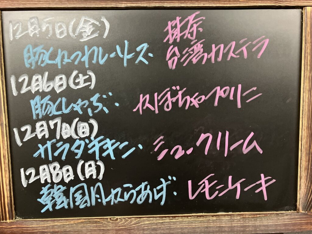 高知 カフェランチ 縁屋 メニュー 2025年12月5日(金)~12月8日(月)香美市 土佐山田 メニュー 2025年12月5日(金)~12月8日(月)香美市 土佐山田 12月 5日(金) 豚かつカレーソース・抹茶台湾カステラ 12月 6日(土) 豚しゃぶ・かぼちゃプリン 12月 7日(日) サラダチキン・シュークリーム 12月 8日(月)韓国風からあげ・レモンケーキ この記事のタイトルとURLをコピーする 高知 カフェランチ 縁屋 メニュー 2025年11月28日(金)~12月 1日(月)香美市 土佐山田 前の記事