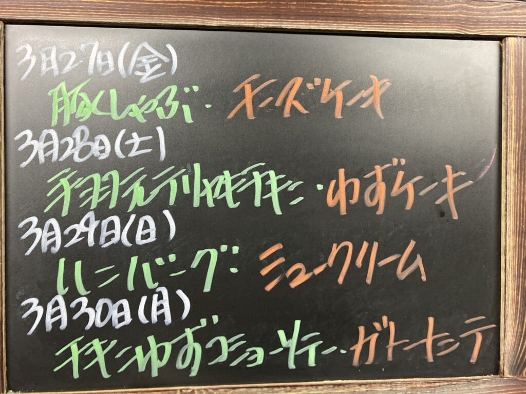 高知 カフェランチ 縁屋 メニュー 2026年3月27日(金)~3月 30日(月)香美市 土佐山田 メニュー 2026年3月27日(金)~3月 30日(月) 3月 27日(金) 豚しゃぶ・チーズケーキ 3月 28日(土) 手羽元テリヤキチキン・ゆずケーキ 3月 29日(日) ハンバーグ・シュークリーム 3月 30日(月)チキンゆずコショーソテー・ガトーナンテ この記事のタイトルとURLをコピーする 高知 カフェランチ 縁屋 メニュー 2026年3月20日(金)~3月 23日(月)香美市 土佐山田 前の記事 高知 カフェランチ 縁屋 メニュー 2026年4月3日(金)~4月 6日(月)香美市 土佐山田 次の記事
